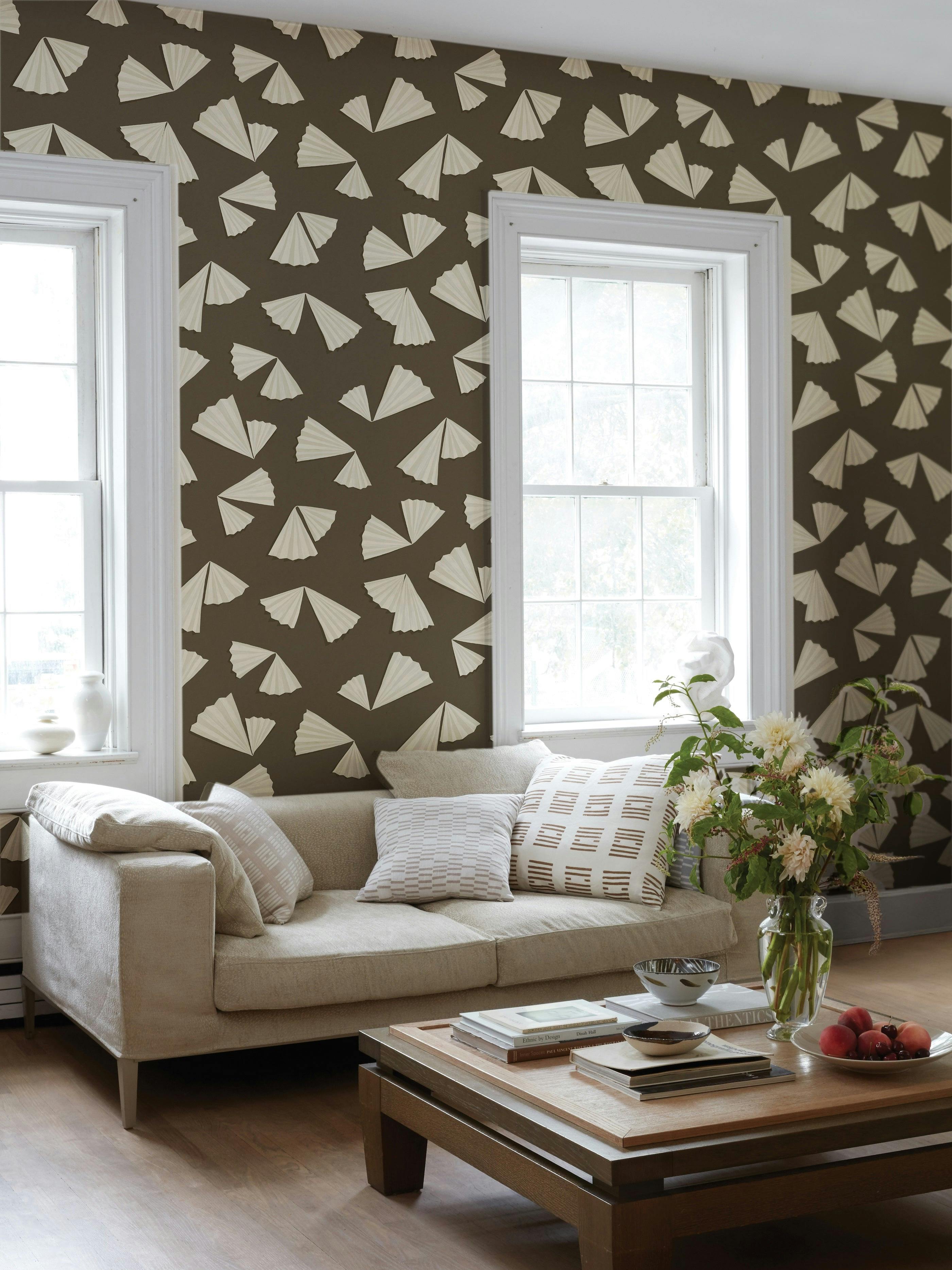 Romantic and soft, ANTOINETTE, sets an atmosphere of fantasy and lightness. Inspired by the famed 18th-century accessory, this wallpaper brings a figurative yet abstract quality to the wall through Gouache-rendered, paper-folded fans that float in a multi-directional, mid-scale layout.