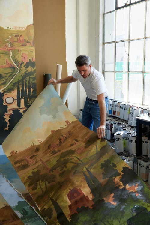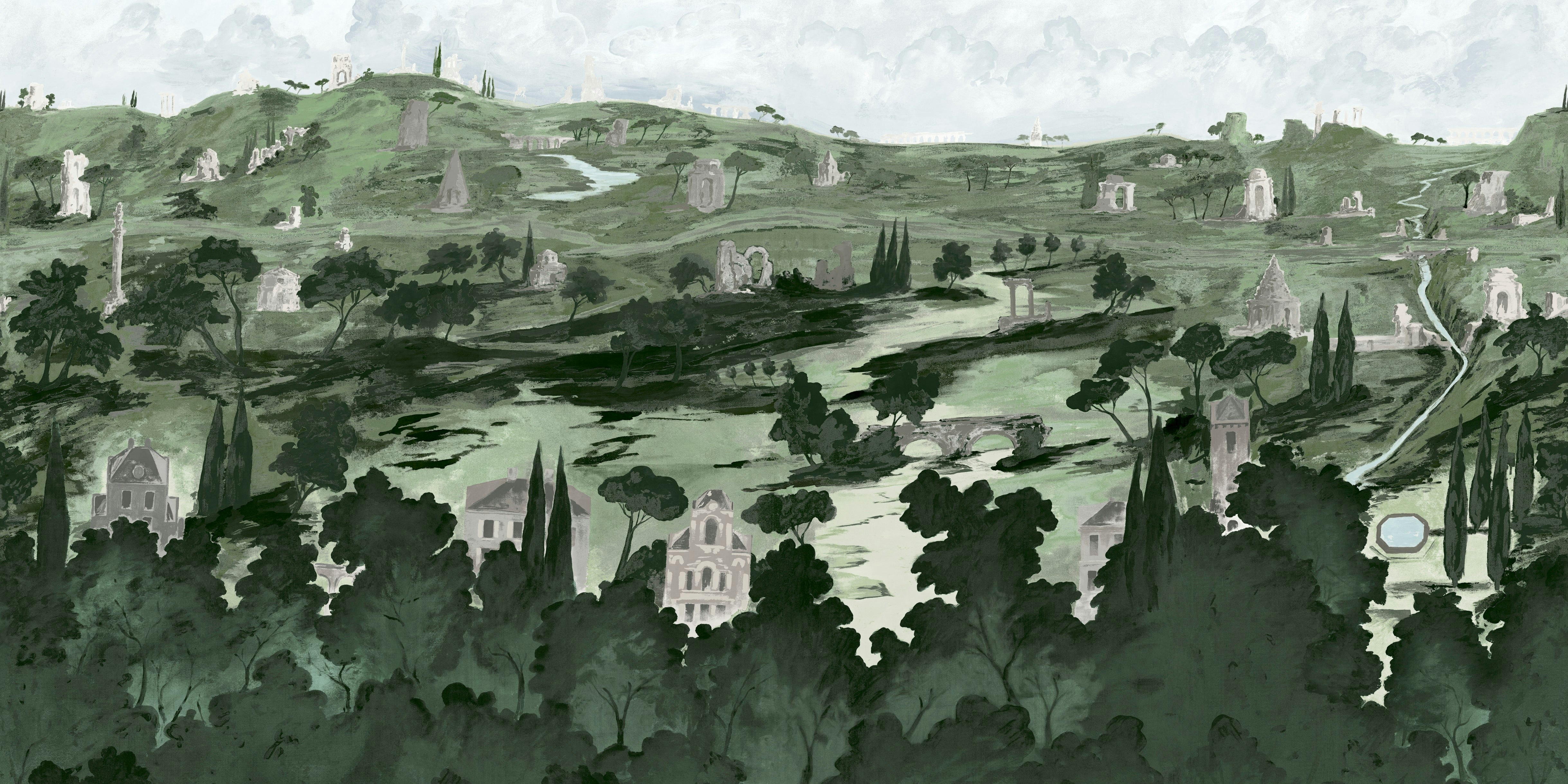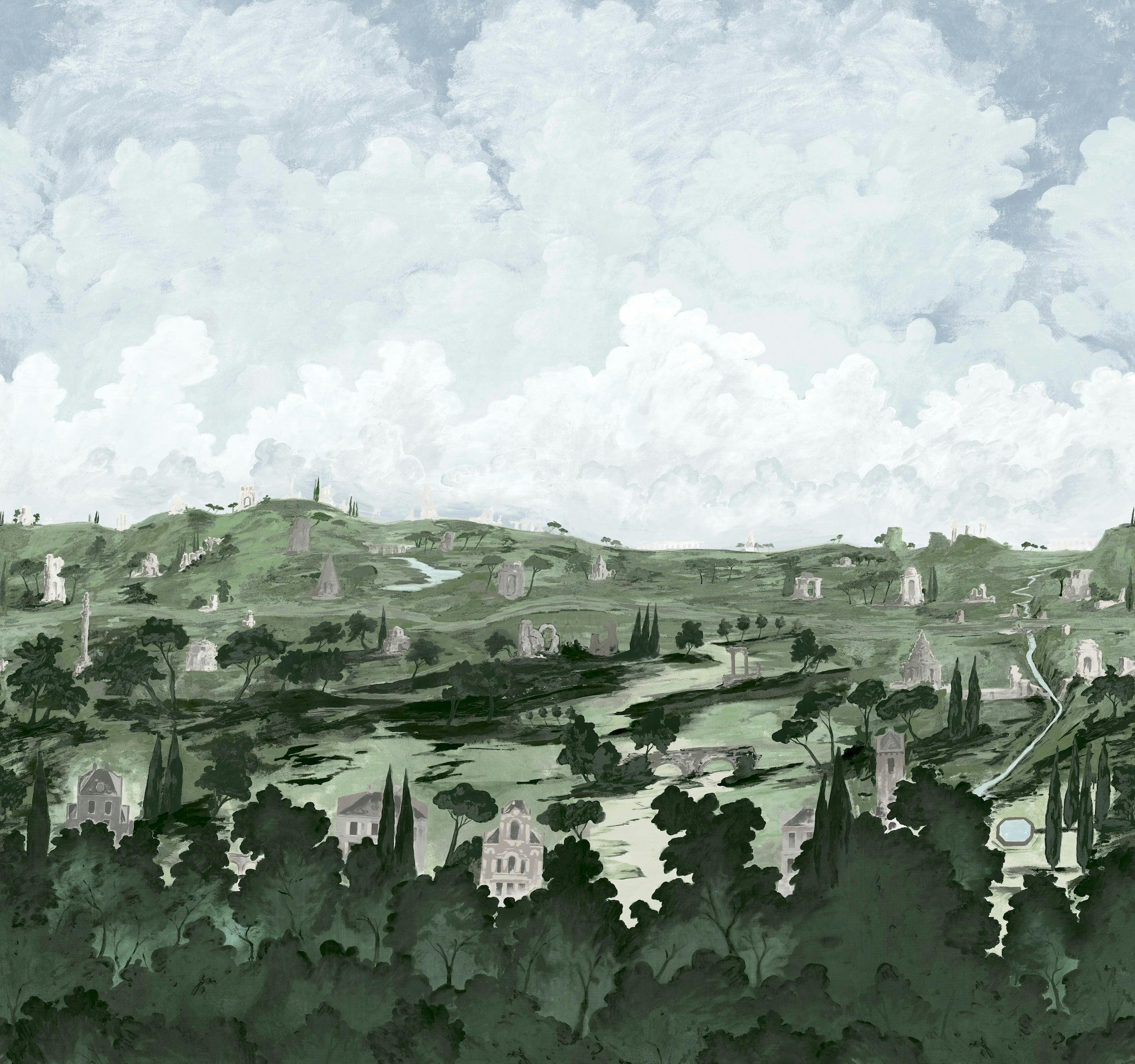 Inspired by the legendary road to Rome, APPIAN WAY PANEL SET is a transportive hand-painted scenic panorama by artist Xavier Donnelly. A landscape of ruins, monuments, and villas painted in rich detail creates a sense of mystery and surprise throughout the design. At 15’ tall by 16’ wide, the scenic mural moves from dense forest to layered architecture to billowing clouds, trimmable for any room. The dramatic scale and stunning painted texture capture the feeling of a fresco painted directly on the wall.