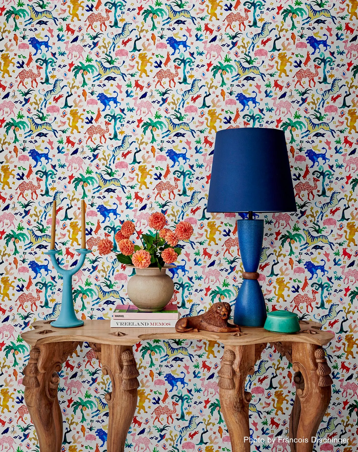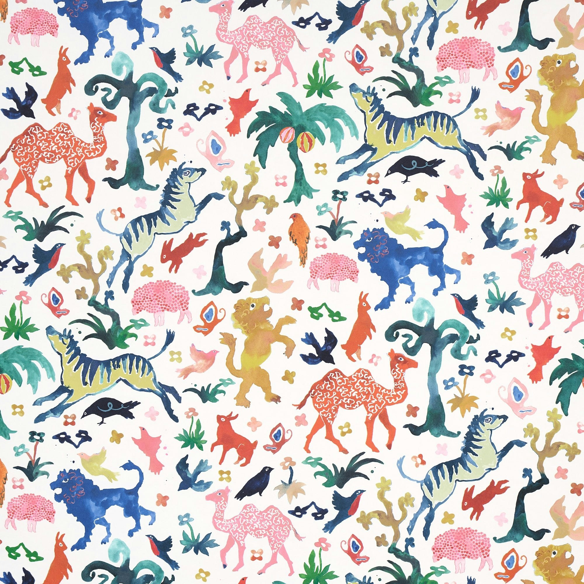Transform your space with the whimsical charm of Happy Menocal’s Beasts wallpaper. This captivating mid-scale design features a lively carnival of exotic creatures and fanciful flora, creating a delightful atmosphere in any room. With its wonderful tonal variations and charming hand-painted aesthetic, this imaginative wallpaper brings a touch of enchantment to your home decor.