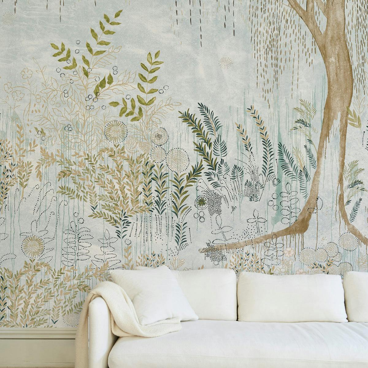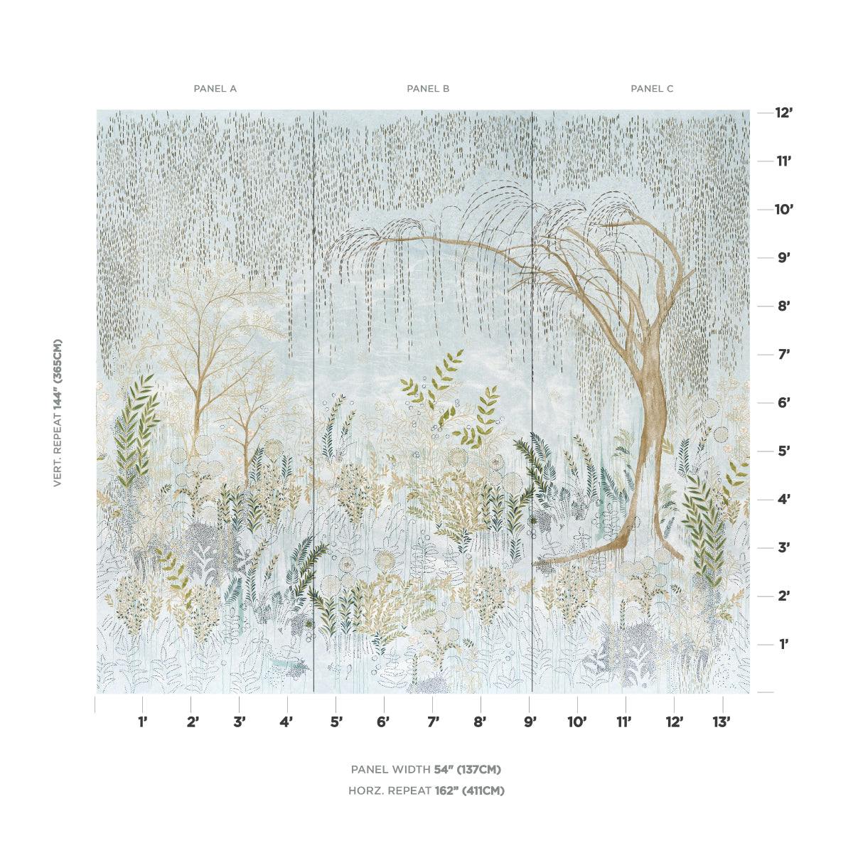 Elevate your home decor with the BISOU PANEL SET, featuring a serene weeping willow mural by California artist Colette Cosentino. Printed on a pearlized ground, the panels shimmer softly, enhancing the artwork’s dreamy, atmospheric quality. This set includes three non-repeating wallpaper panels, perfect for creating an elegant focal point in any room. Ideal for those seeking art-inspired wallpaper panels with a refined, nature-inspired aesthetic.