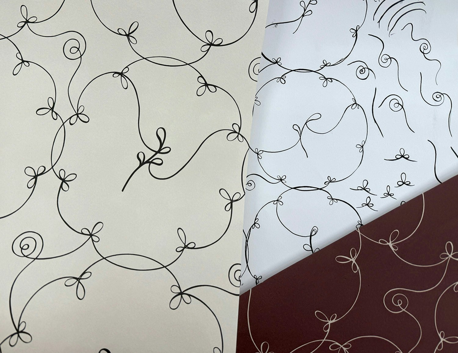 Named after a style of openwork embroidery, BRODERIE is a lyrical design featuring delicate linework with a nod to natural motifs. The two-color design was created as a continuous line drawing in our studio, where the pen is never lifted from the page. The result is an intricate, airy mid-scale design suited for any space.
