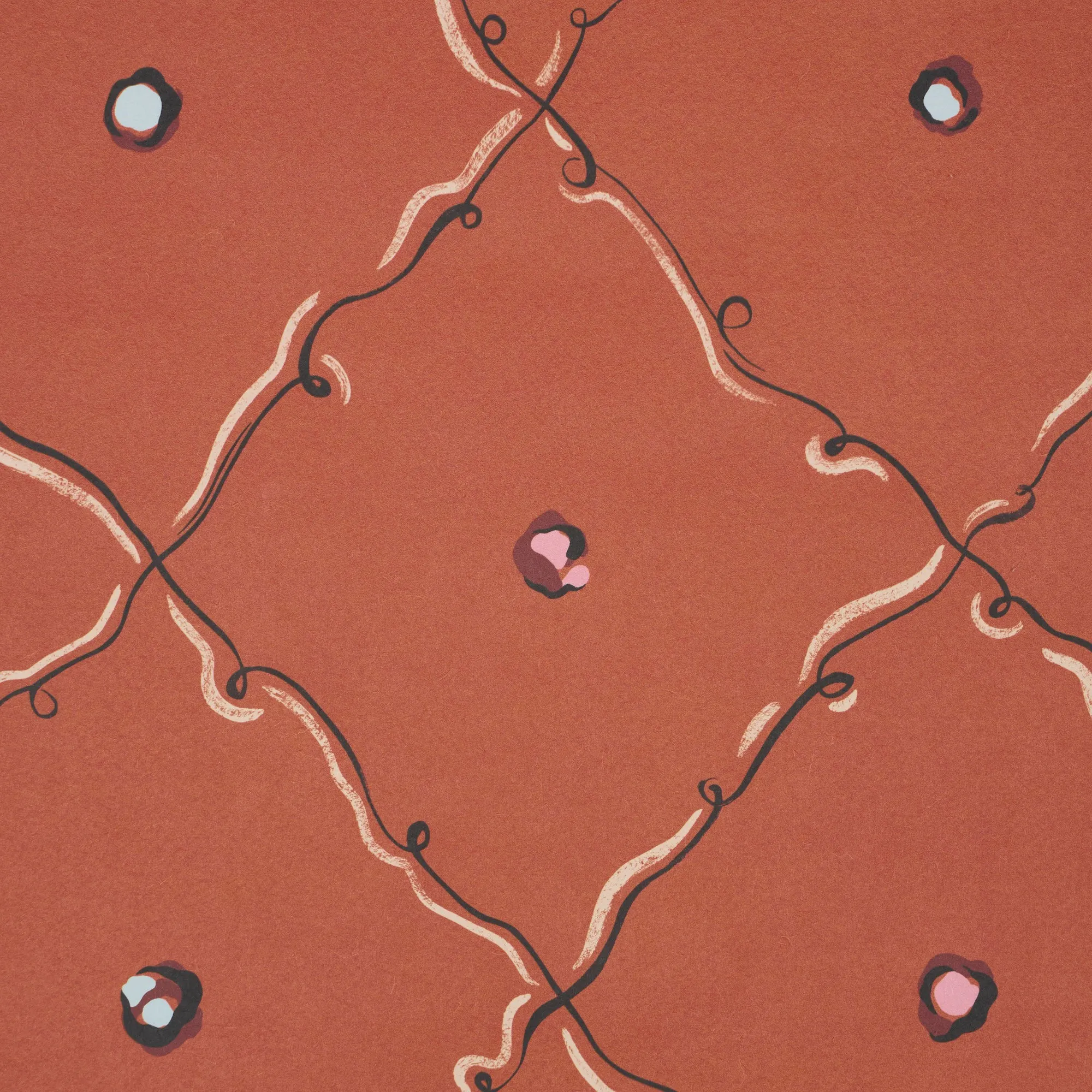 COLETTE is a playful trellis design inspired by 20th-century illustrator Christian Bérard’s whimsical trompe l’oeil paintings. Painted in our studio in ink-and-gouache, this mid-scale trellis design is filled with delightful detail and stylized pops of color.