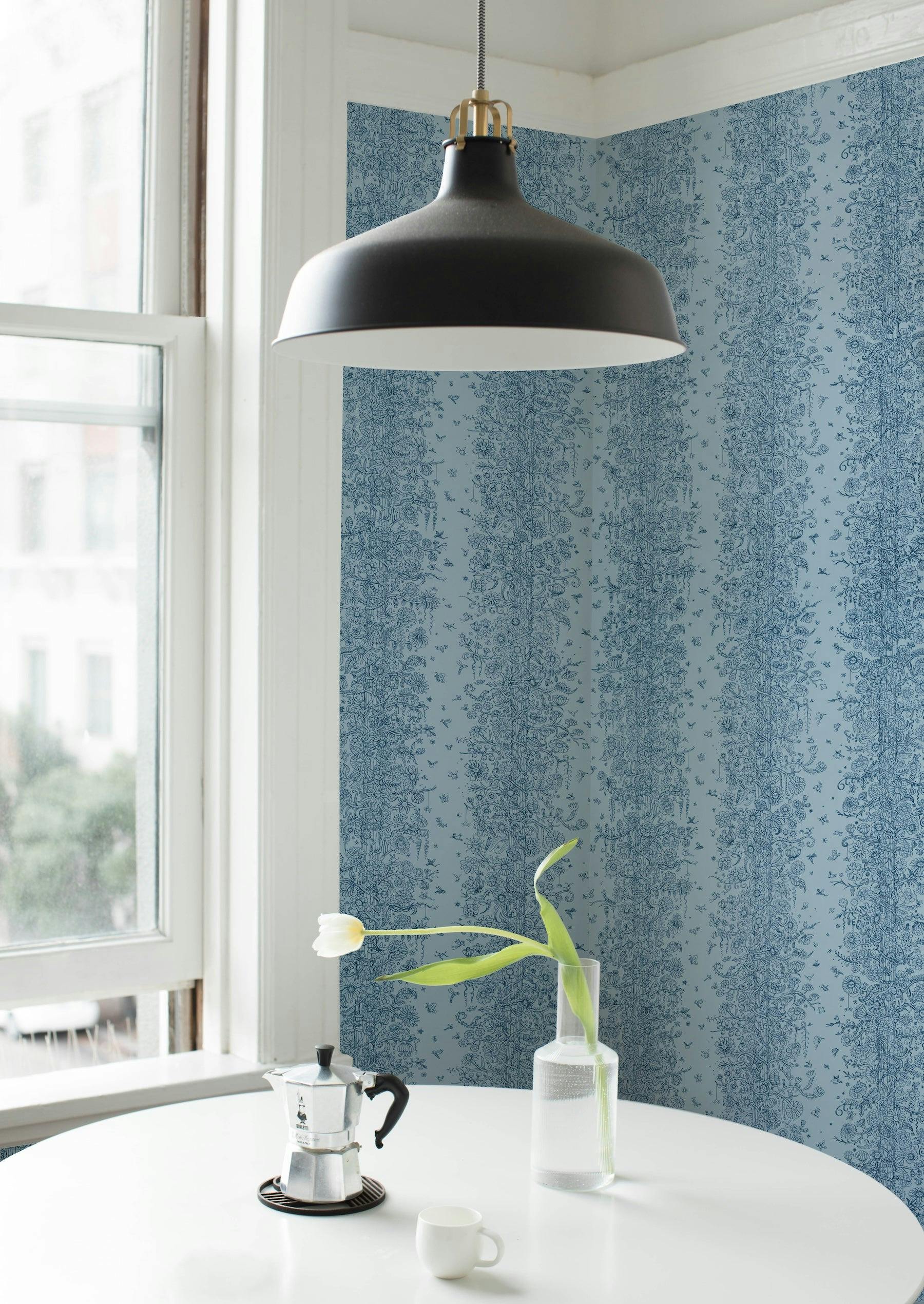 Part of the New Yorker Collection, Edward Steed’s Towers of Flowers is a playful take on a familiar form. Based on newly created original artwork, this wallpaper features a large-scale floral stripe intricately detailed with whimsical flowers and grinning faces.