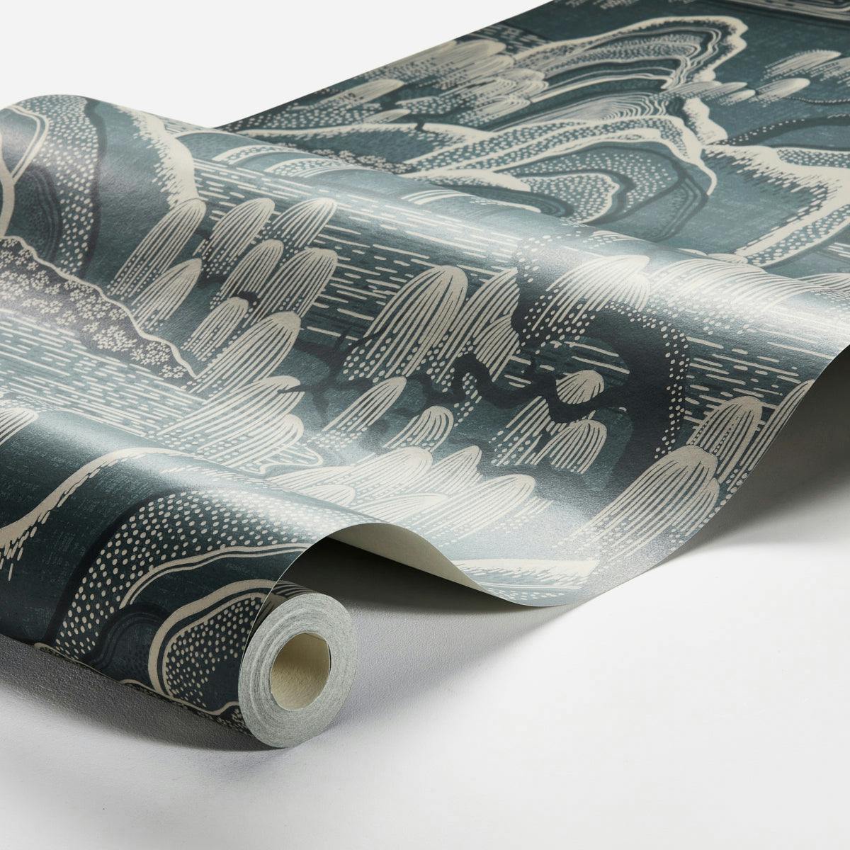 Indigo Garden by Boråstapeter features a captivating scene of rolling hills, graceful willow trees, and rippling water, creating a serene, nature-inspired atmosphere. With its richly textured appearance, this FSC-certified wallpaper brings a peaceful, timeless elegance to any space.