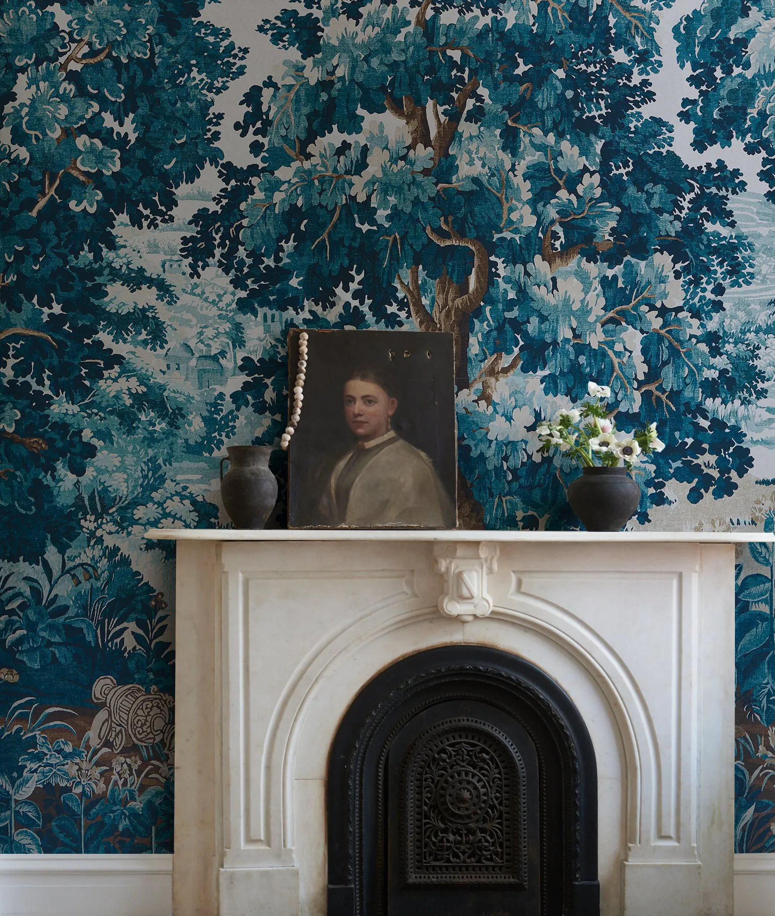 Crafted with over 800 hours of meticulous work, this monumental three-panel wallpaper stretches 16 feet tall, offering a breathtaking focal point in any room. With its historically accurate design and rich, antique patinated finish, La Fôret delivers both a timeless, romantic aesthetic and a bold, playful flair.