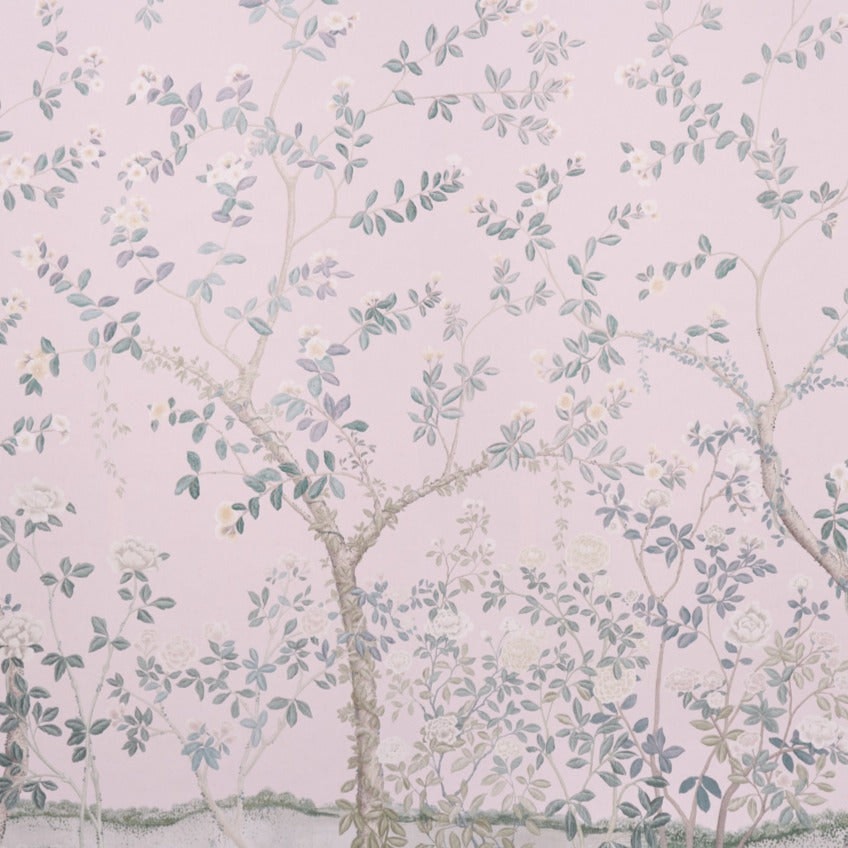 Transform your space with the exquisite Madame De Pompadour Panel Set by renowned designer Miles Redd. This luxurious wallpaper set blends the timeless beauty of an English garden with the intricate elegance of Chinoiserie. Originally hand-drawn to scale on French canvas, the design features a lush, expansive floral motif across two 12-foot panels.