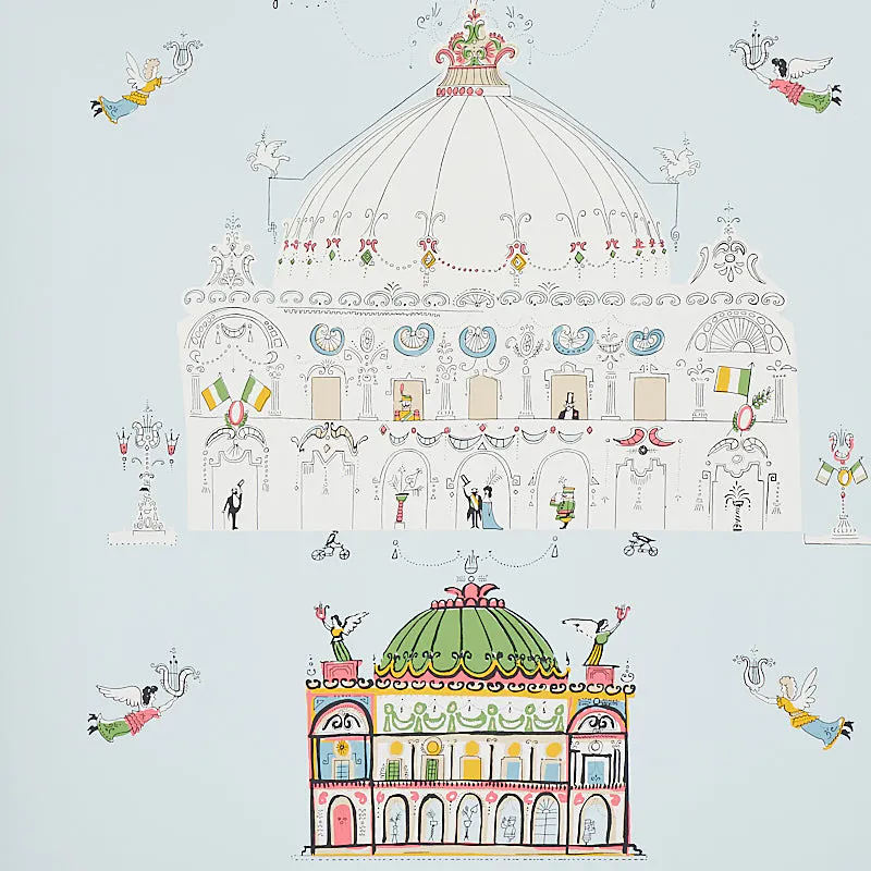 A joyful tribute to the Palais Garnier, this Saul Steinberg wallpaper reimagines the iconic Paris Opera with his signature wit and charm. Renowned as a celebrated cartoonist for The New Yorker, Steinberg brings a playful perspective to the grand facade, transforming it into whimsical caricatures complete with fluttering angels and cheeky nods to the building's opulence. With architectural details connected by elegant swags, the pattern evokes the sophistication of 18th-century arabesque designs. Part of the Flight of Fancy collection, this large-scale, sky-toned wallpaper adds a touch of artistic humor and grandeur to any space.