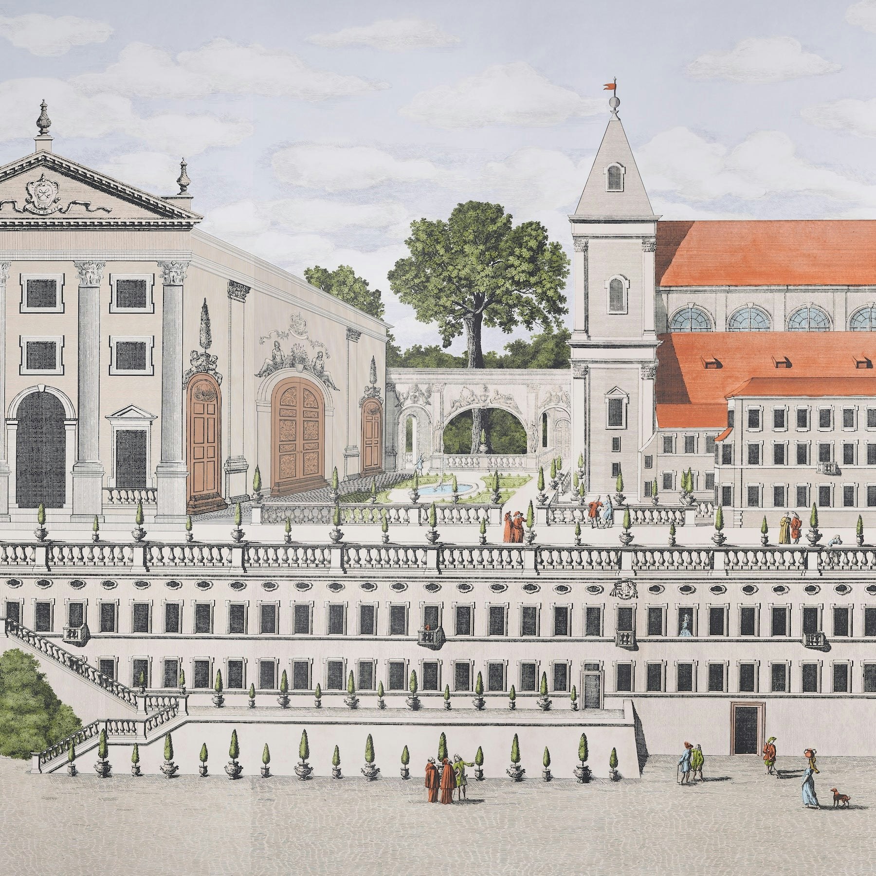 Inspired by an antique document, Piazza Firenze in document is a splendid three-panel wallpaper set designed by Johnson Hartig of Libertine. This splendid architectural panorama is beautifully detailed and printed on uncoated paper for a marvelous antique effect.
