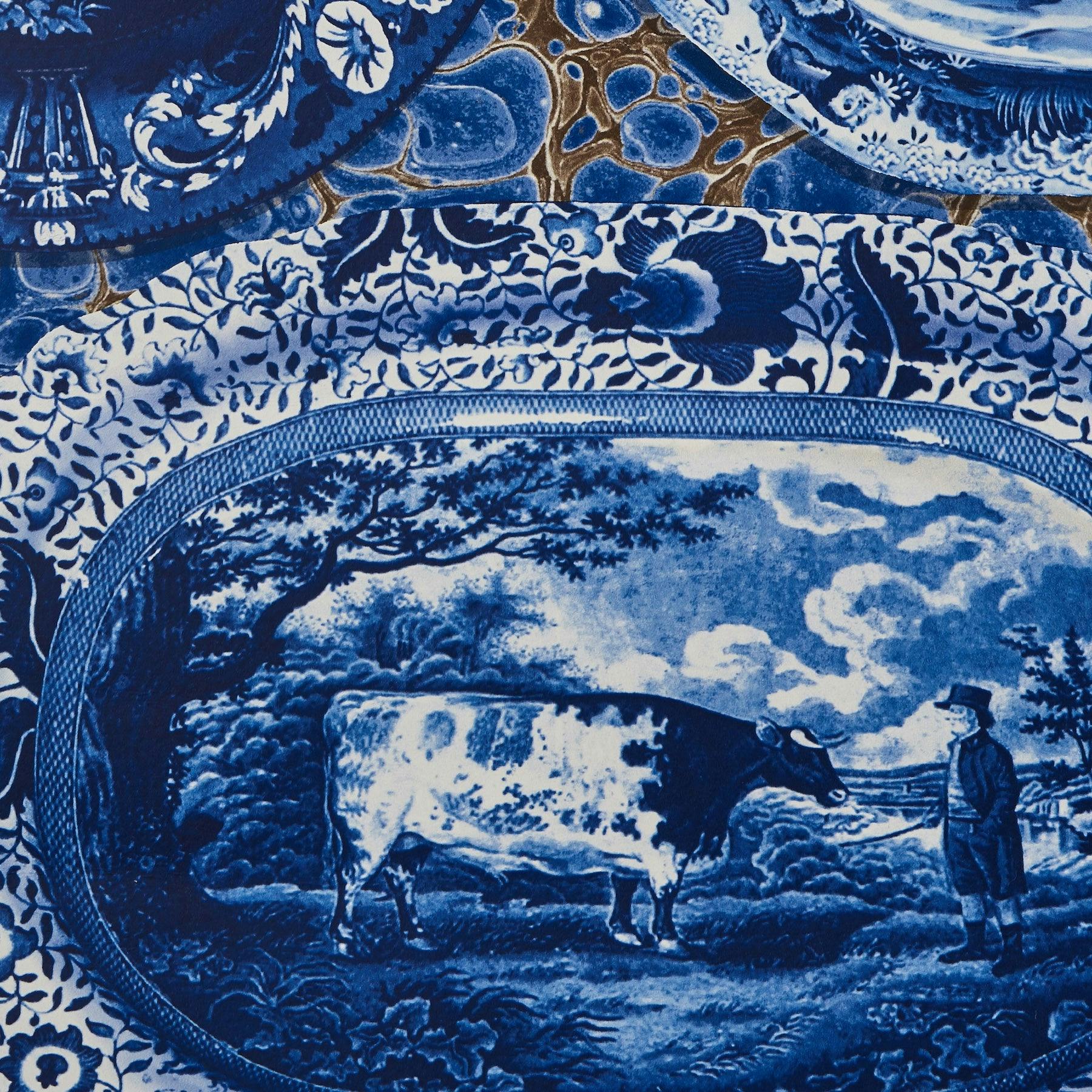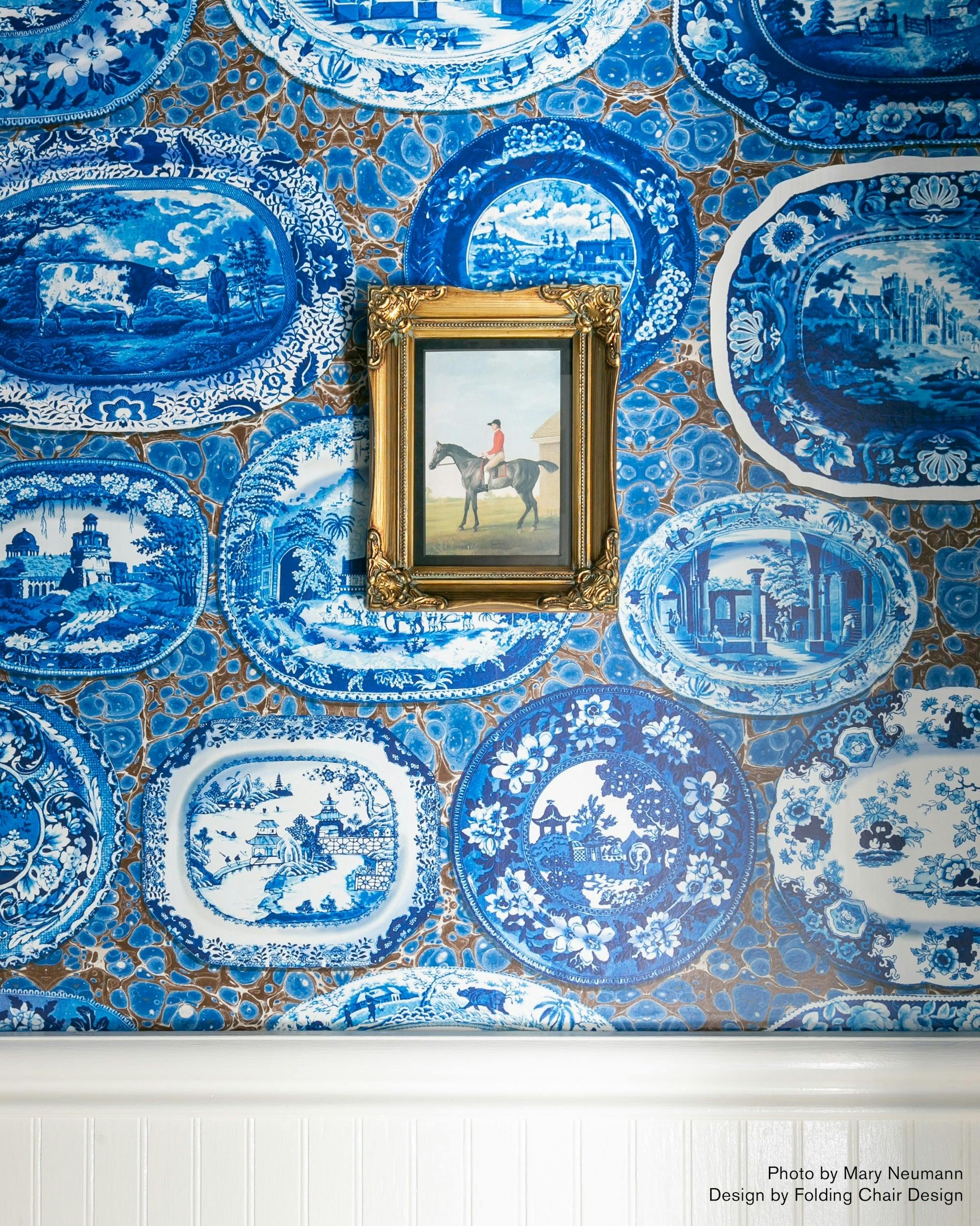 Transform your home decor with a trompe l’oeil masterpiece by the renowned artist Johnson Hartig. This captivating wallpaper features a mesmerizing pattern of transferware serving dishes skillfully mounted on a marbleized background, creating the ultimate layered illusion and instant drama in any space. No hammers or nails required, as this unique wallcovering effortlessly enhances your room into a work of art.