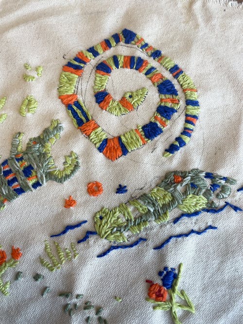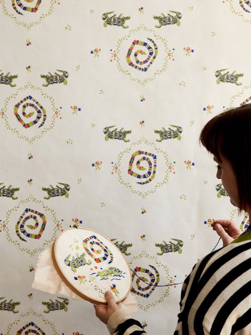 An invitation to look closer, REPTILIA, our modern doily-like design depicts hand-embroidered creatures from the swamp encased in flora and fauna. Also available in Peel & Stick in Bright Multi colorway.
