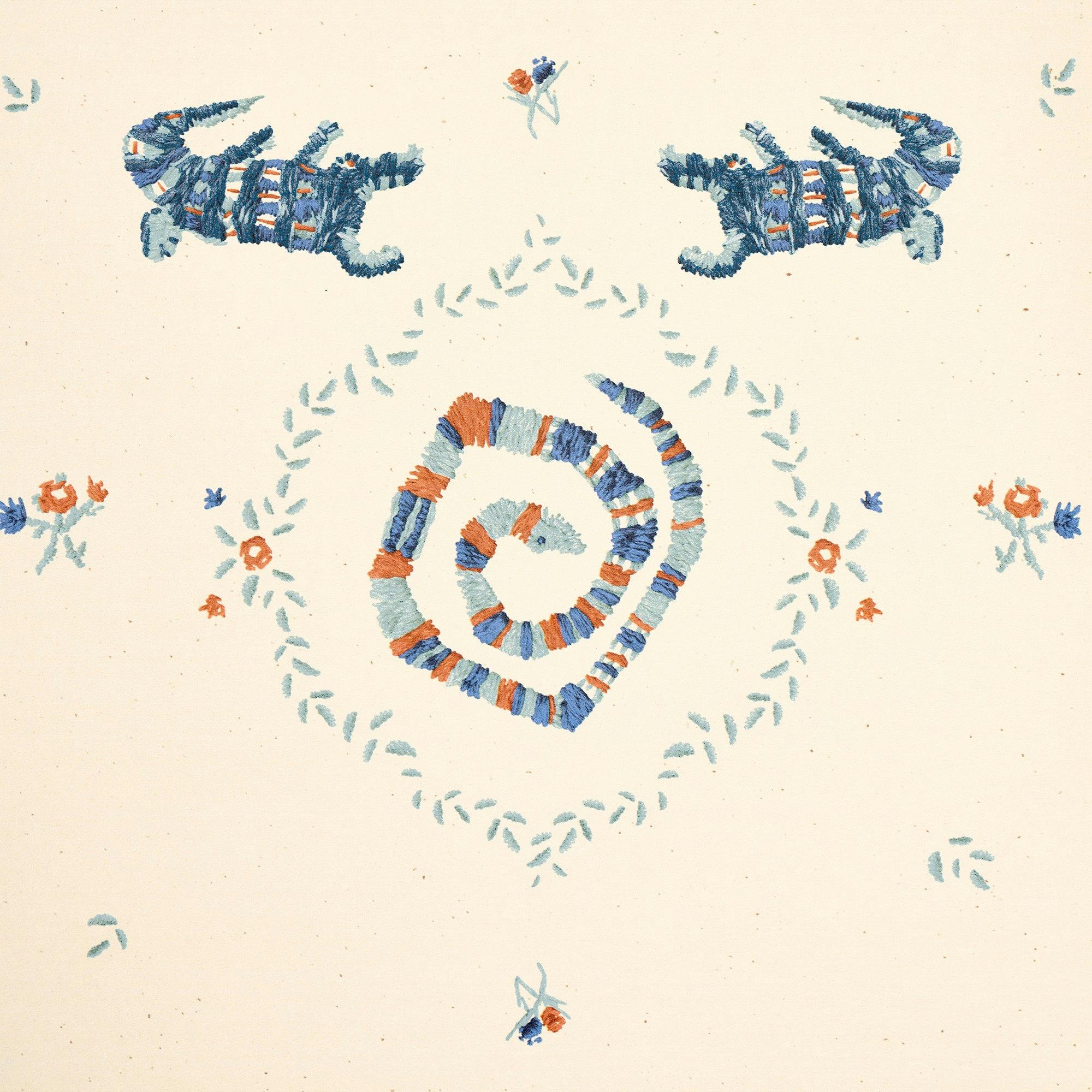 An invitation to look closer, REPTILIA, our modern doily-like design depicts hand-embroidered creatures from the swamp encased in flora and fauna. Also available in Peel & Stick in Bright Multi colorway.