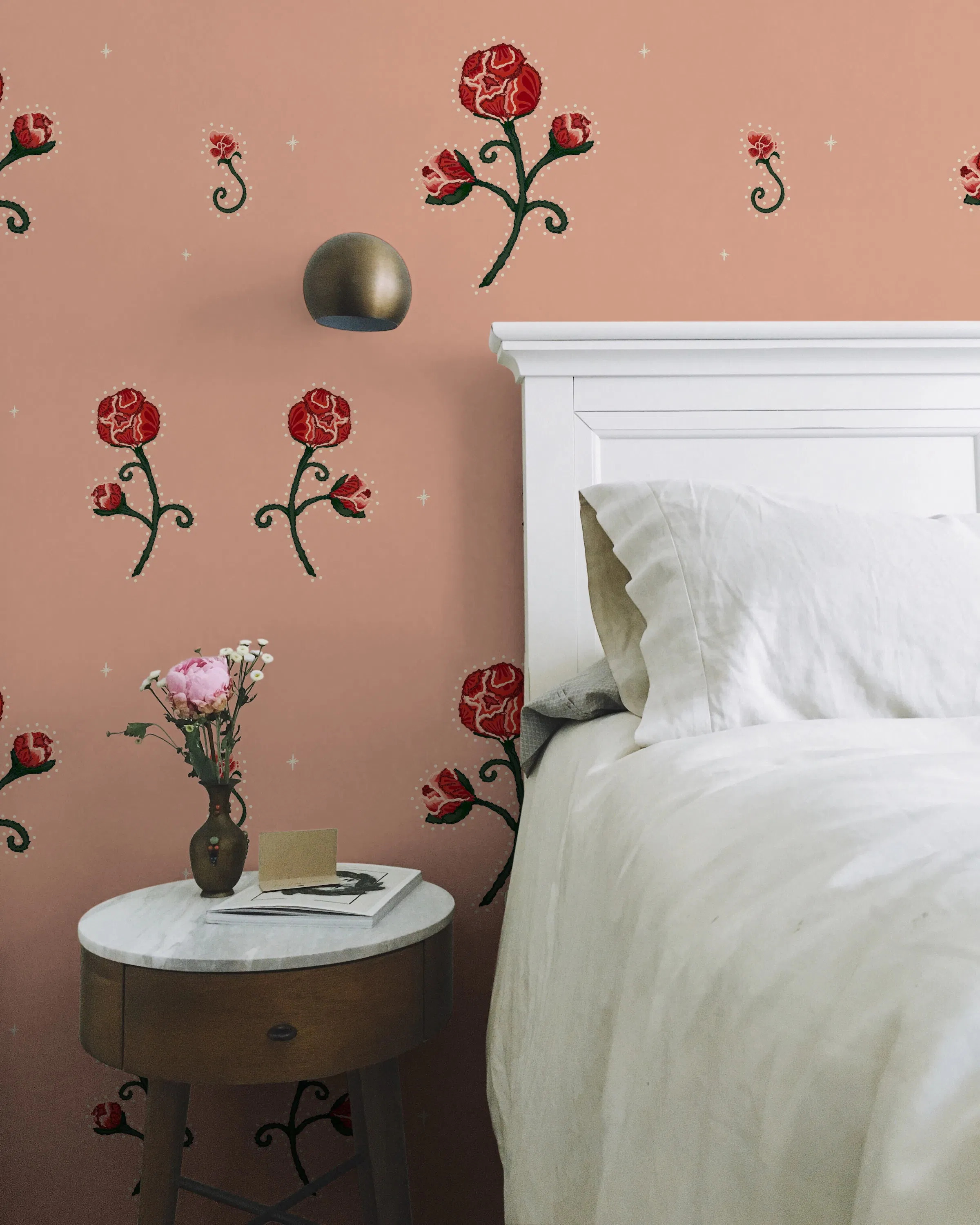 Dolly Parton, John Lennon, and Elton John are some of the music legends known for donning the infamous Nudie Suit. RHINESTONE COWBOY pays homage to the bejeweled chain-stitch wonders by Nudie Cohn. In our own mid-scale floral interpretation, Peony-like flowers are dotted with details and a simple cadent layout. Designed from original chain-stitch embroidery, this striking design will bring out your inner showperson. Select colorways available in Peel & Stick.