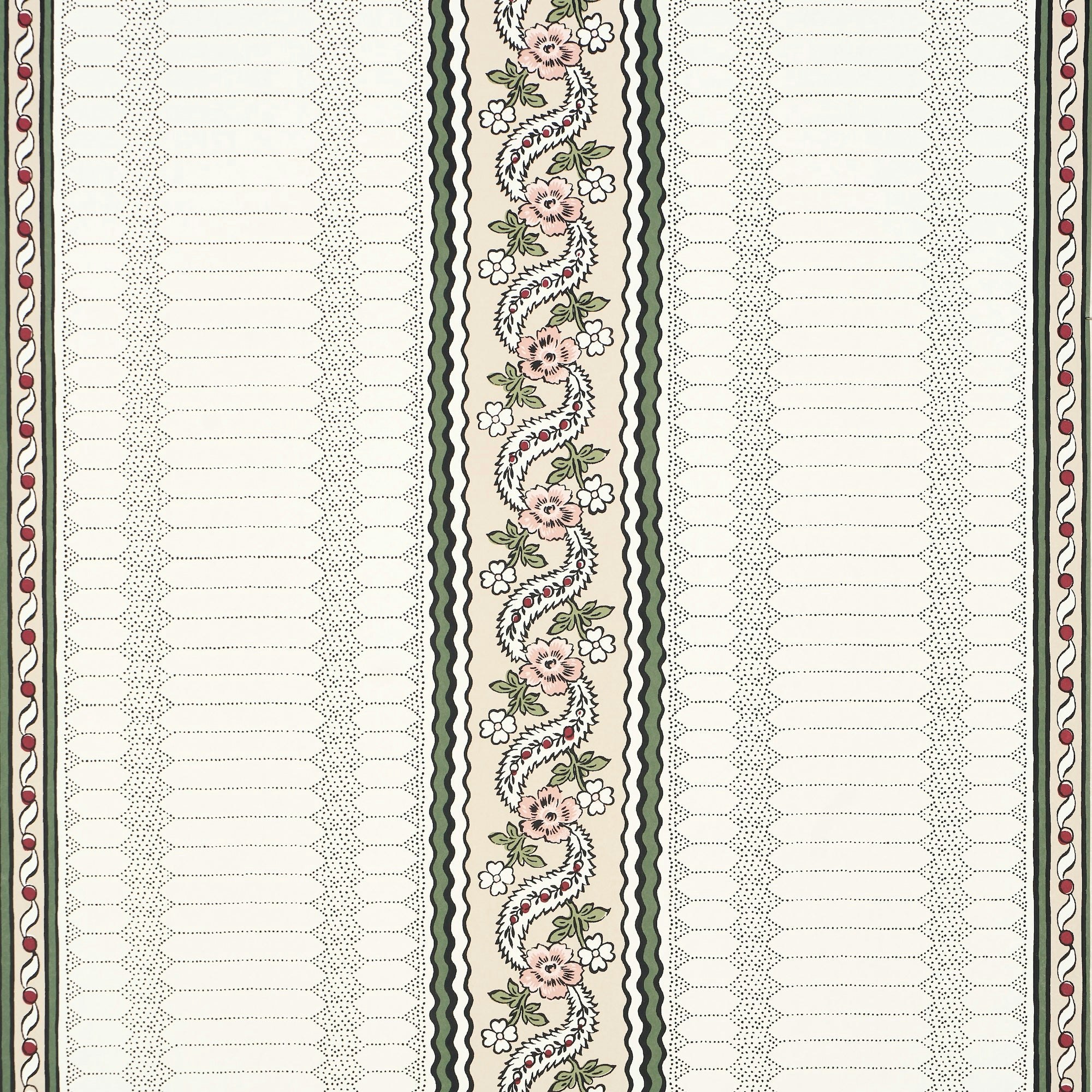 Rita Konig was inspired by several antique textiles in her personal collection when she created Serena Stripe wallpaper, a timeless pattern and the companion to Serena Garland. Screen-printed on a flat paper ground with painstaking attention to detail, this sophisticated medium-scale design mixes beautifully with other patterns.