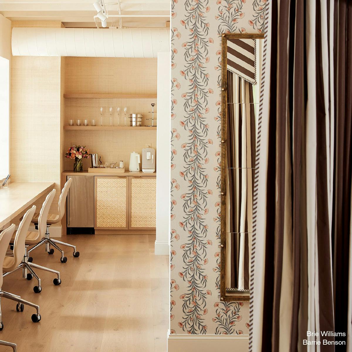 Tasmanian Mimosa by Celerie Kemble is a stunning wide-width wallpaper inspired by the Arts and Crafts patterns of English architect C.F.A. Voysey. This large-scale botanical stripe features delicate, hand-drawn bottle-brush blooms, creating an undulating, organic rhythm that adds a splendid floral touch to any room.