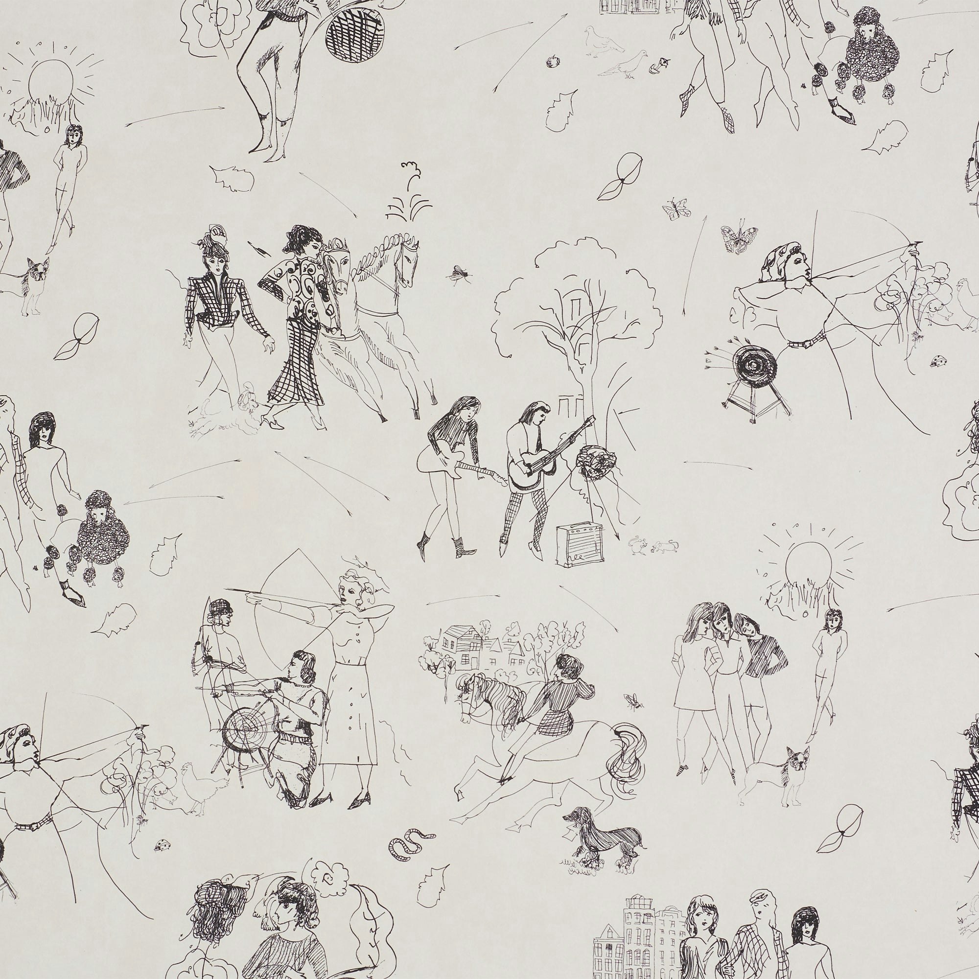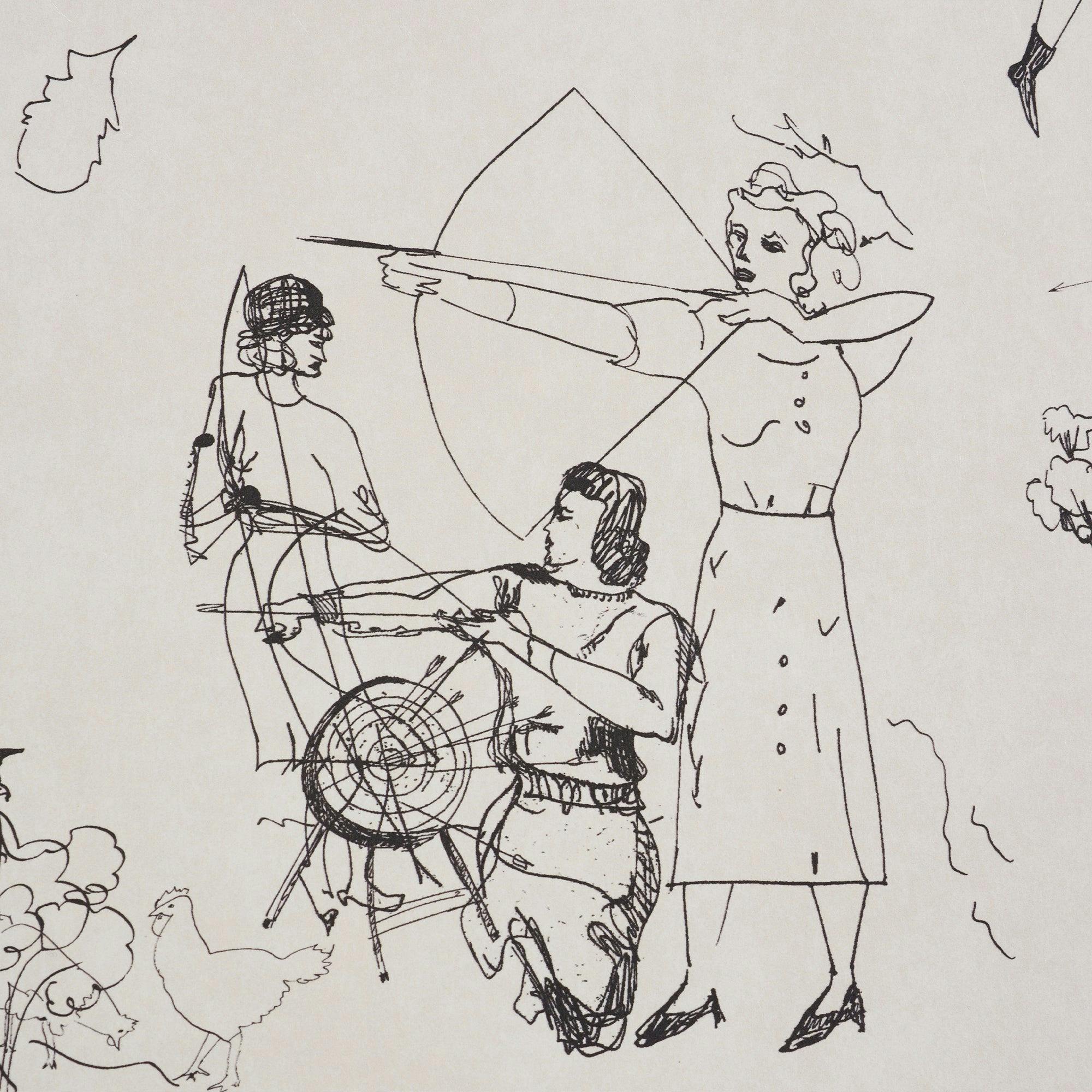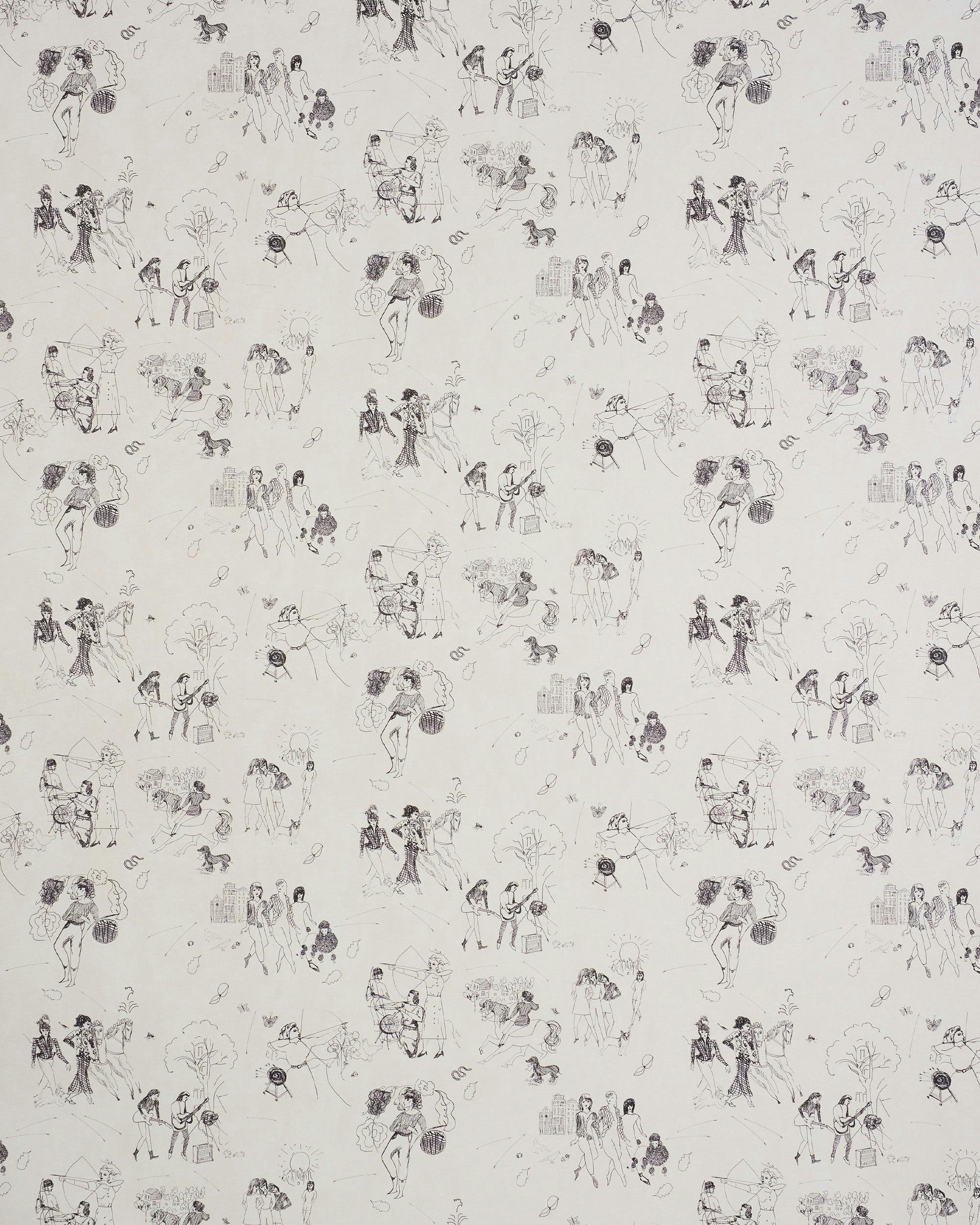 Toile De Femmes is a lyrical, contemporary wallpaper designed by Barrie Benson and Chandra Johnson of Peg Norriss in collaboration with Schumacher. Featuring hand-drawn female motifs by celebrated artist Jackie Gendel, this modern twist on classic toile wallpaper celebrates bold femininity, timeless craftsmanship, and artistic storytelling. Showcased in HBO's Sex and the City sequel, And Just Like That, this statement-making pattern captures whimsical vignettes of women at leisure, riding horses, and practicing archery. Perfect for accent walls, powder rooms, and creative interiors, Toile De Femmes is an elevated, artful design that blends history with modern style.