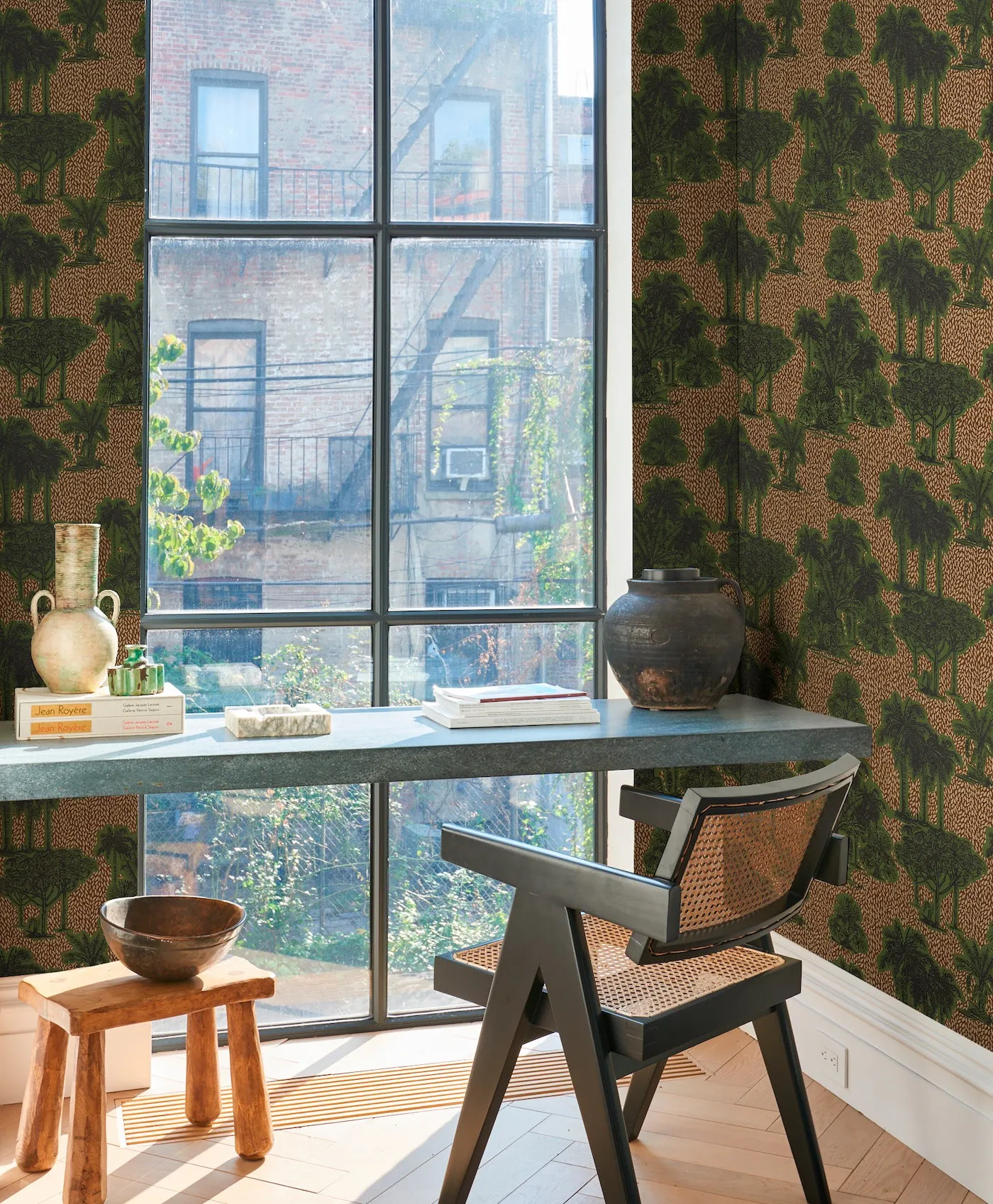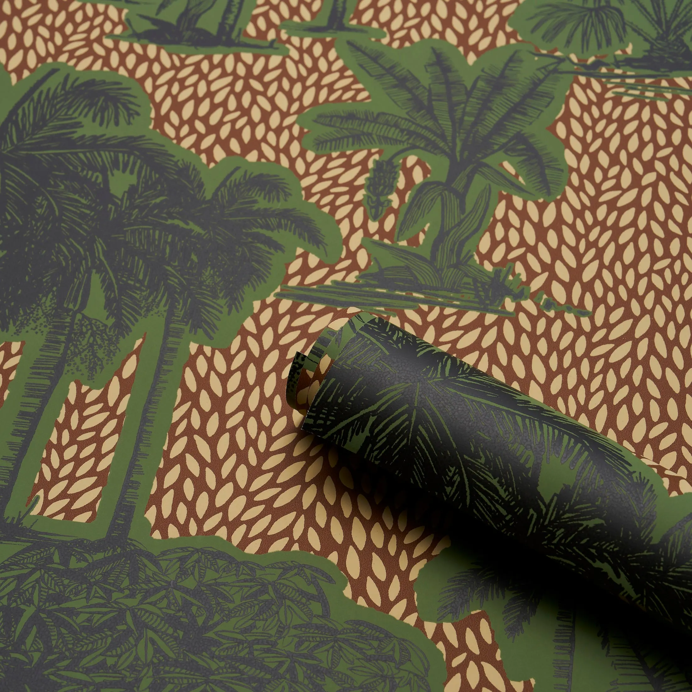 Fashion designer Johanna Ortiz was inspired by French toile de Jouy and African wax prints when she imagined Tropical Safari, a wallpaper she loves so much that she has used it in her New York City boutique. Featuring stands of tropical plants and a rhythmic contrasting background, this imaginative wallpaper represents a vibrant fusion of cultures and traditions.