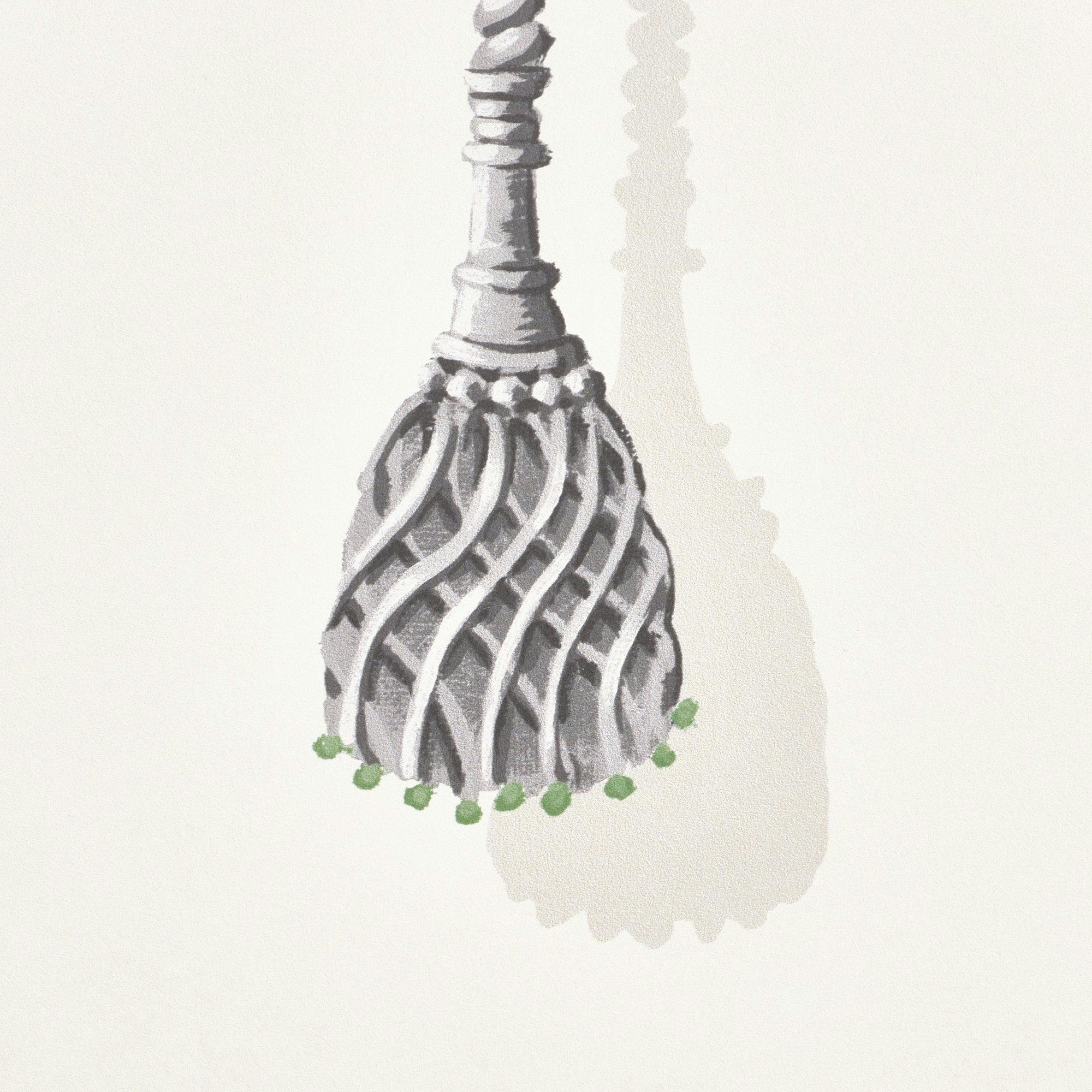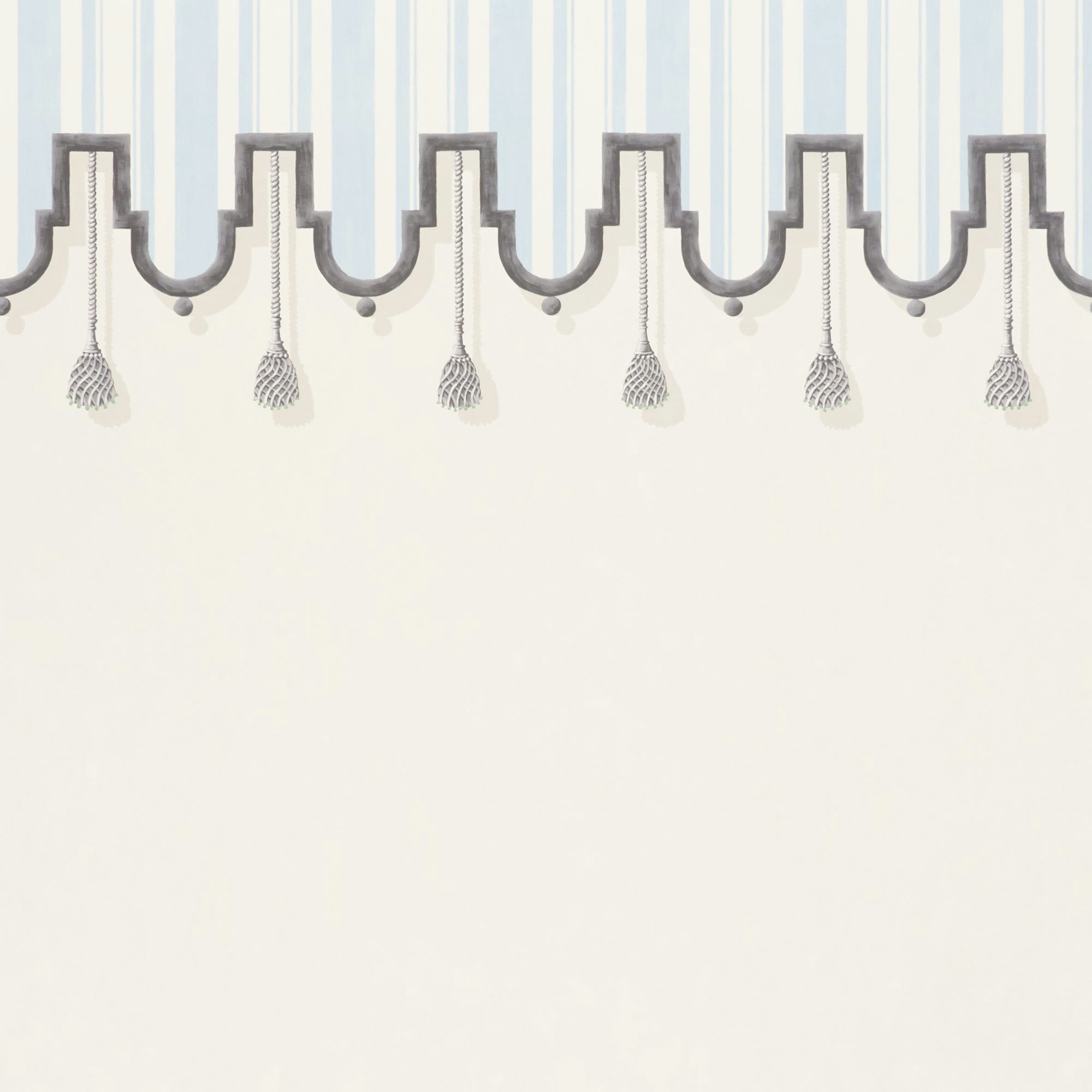 Villa is a panel design that instantly creates the look of a tented room. Its scalloped border and chic painterly tassels add instant personality to a room. Tenting ends at 53 ½”.