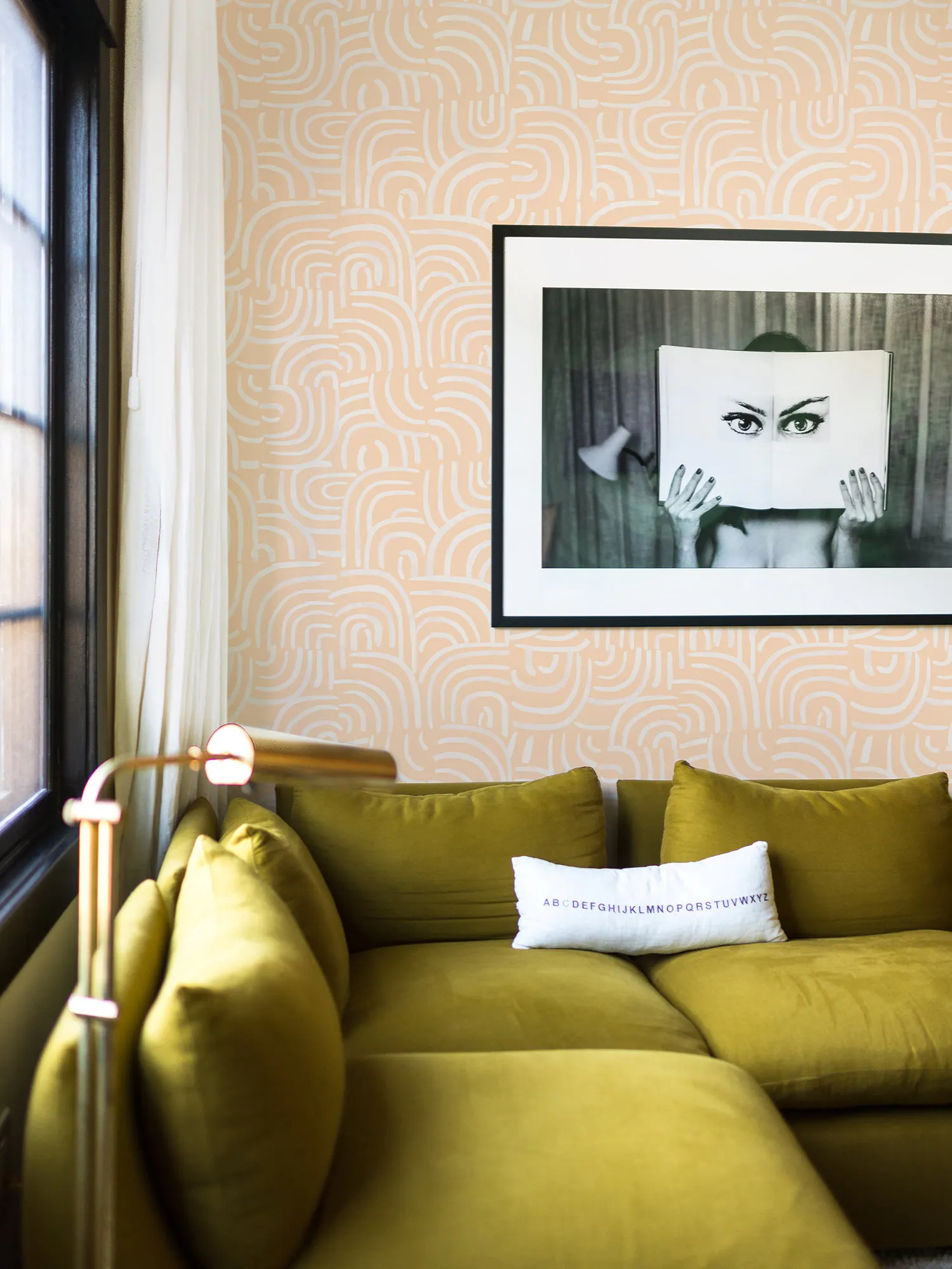 Lyrical arches create a surface of multidirectional line, color and rhythm. Mid-scale design with small elements that transform into a larger composition. Also available in Peel & Stick in Blue & Green colorway.